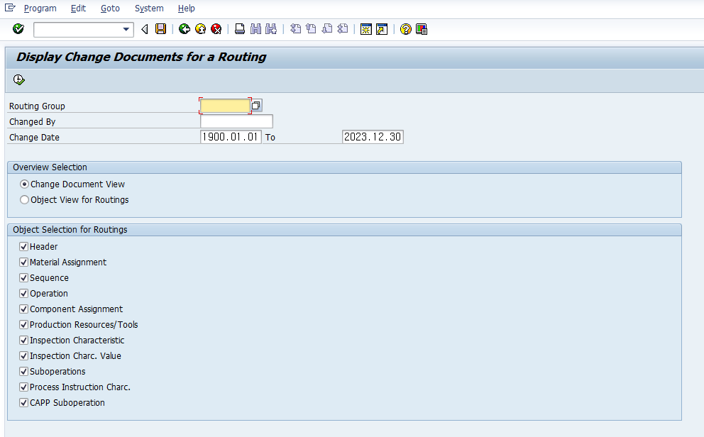 조회조건으로 라우팅그룹, 변경자, 변경일을 입력할수있으며, 라우팅그룹 값은 CA03 (Routing 조회) 에서 확인할수있습니다.